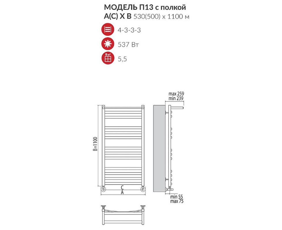 Водяной полотенцесушитель Терминус Енисей П13 500х1100 с полкой