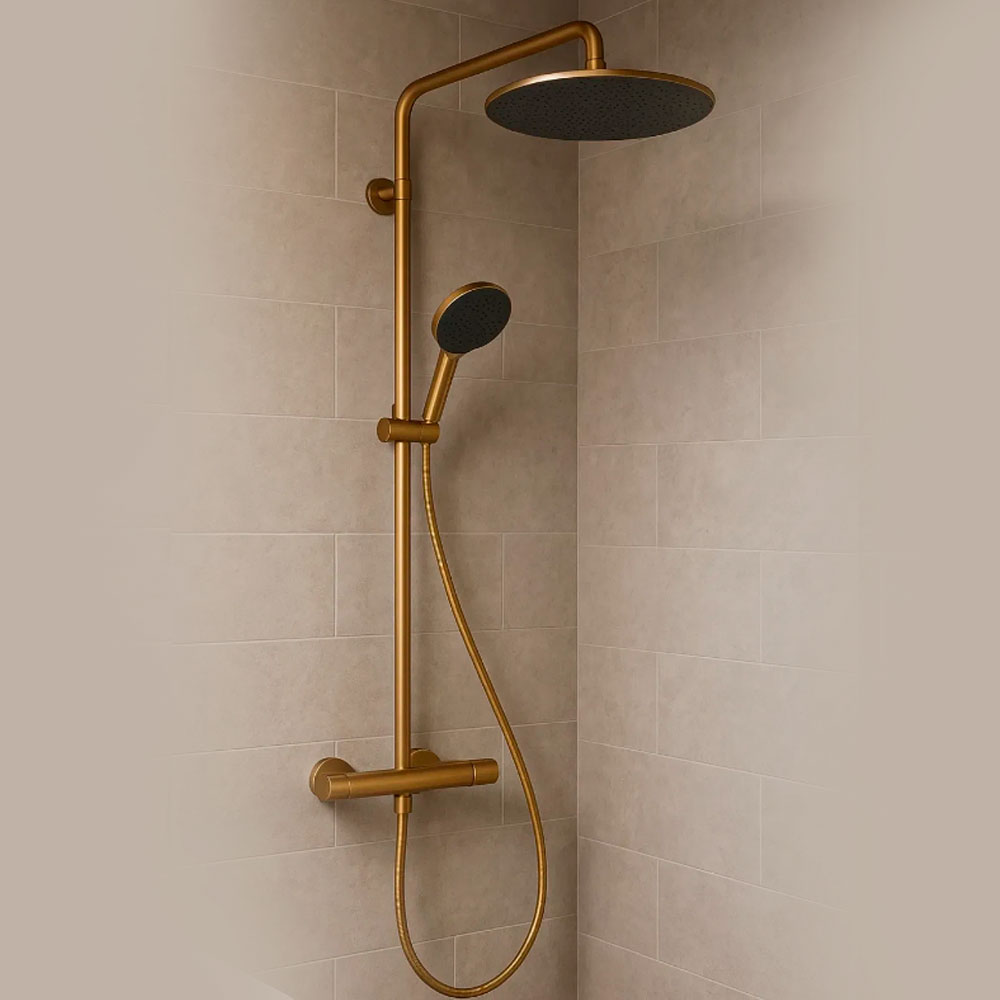 Душевая система hansgrohe Raindance Alive S Puro 300 1jet 24592140 с термостатом Ecostat Element в элегантном бронзовом исполнении — это современное решение для вашей ванной комнаты, которое сочетает в себе передовые технологии, стильный дизайн и максимальный комфорт.