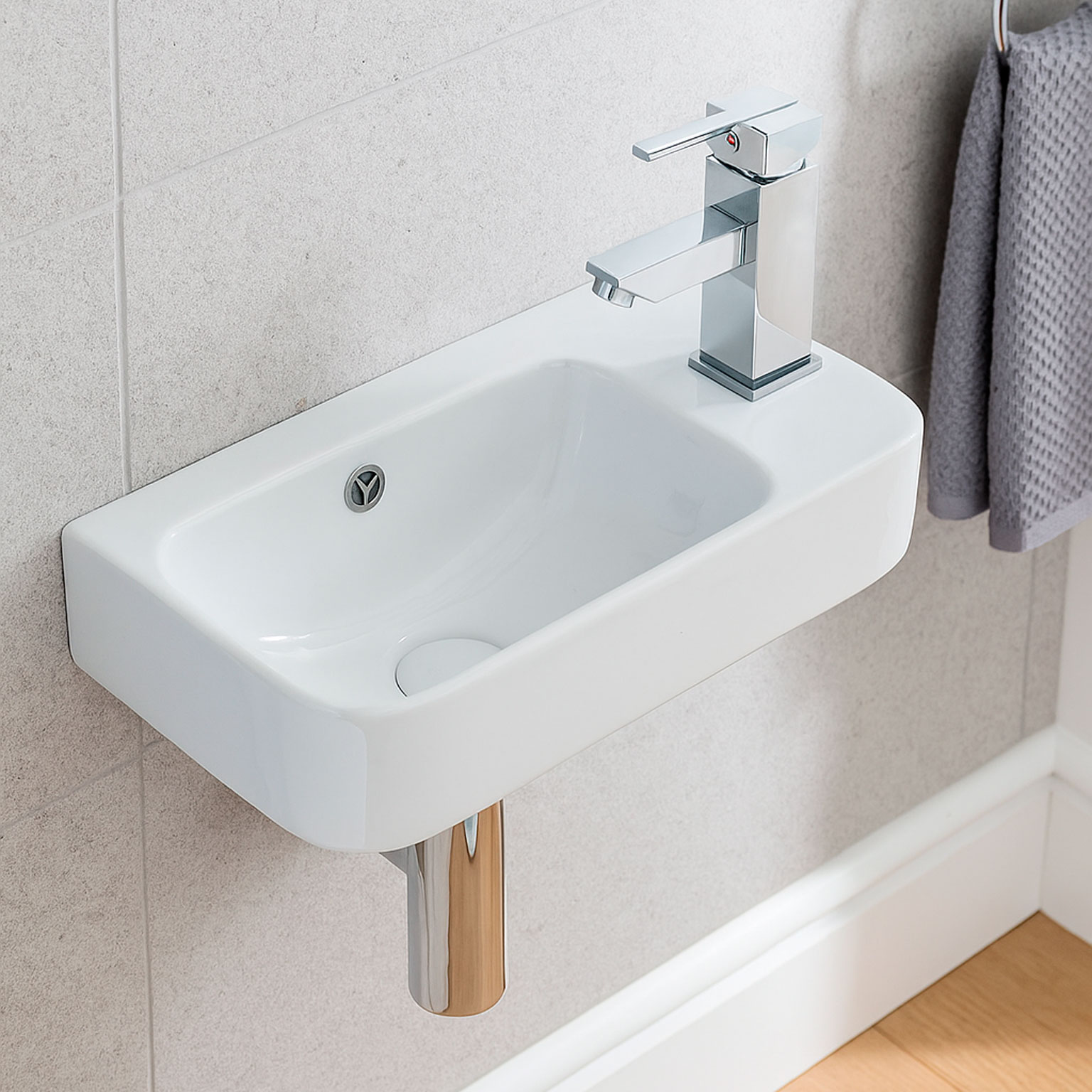 Подвесная мини раковина с переливом и отверстием под смесителей с правой стороны HANS HS-5117-R, размер 45x26 см, белый цвет.