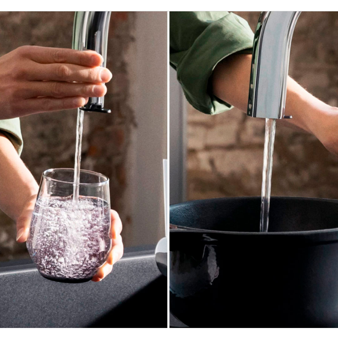 Одним нажатием кнопки кухонный смеситель подает фильтрованную негазированную питьевую воду.