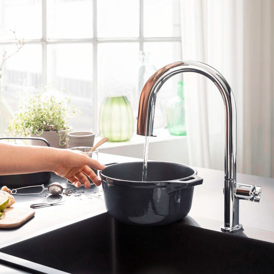 Высокотехнологичный кухонный смеситель Hansgrohe Aquiturra M91 76803000 с функцией фильтрации от hansgrohe, очищает воду из-под крана насыщая ее минералами.