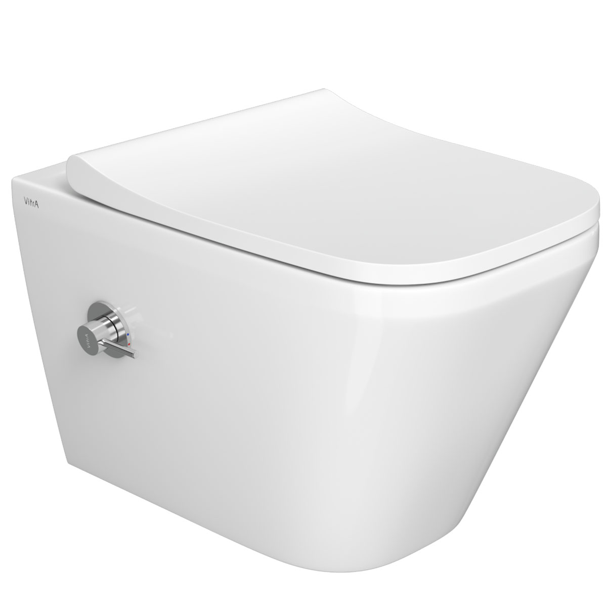 Безободковый подвесной унитаз с функцией биде от турецкого производителя Vitra Integra 7082B003-7209 со встроенным смесителем и тонким сиденьем 191-003-009 с микролифтом.