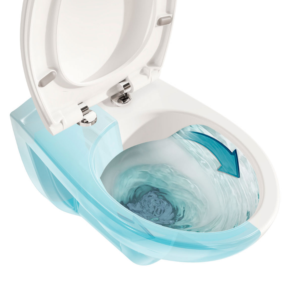- Безободковая чаша — гигиеничное решение благодаря отсутствию мест где могли бы скапливаться грязь и бактерии.