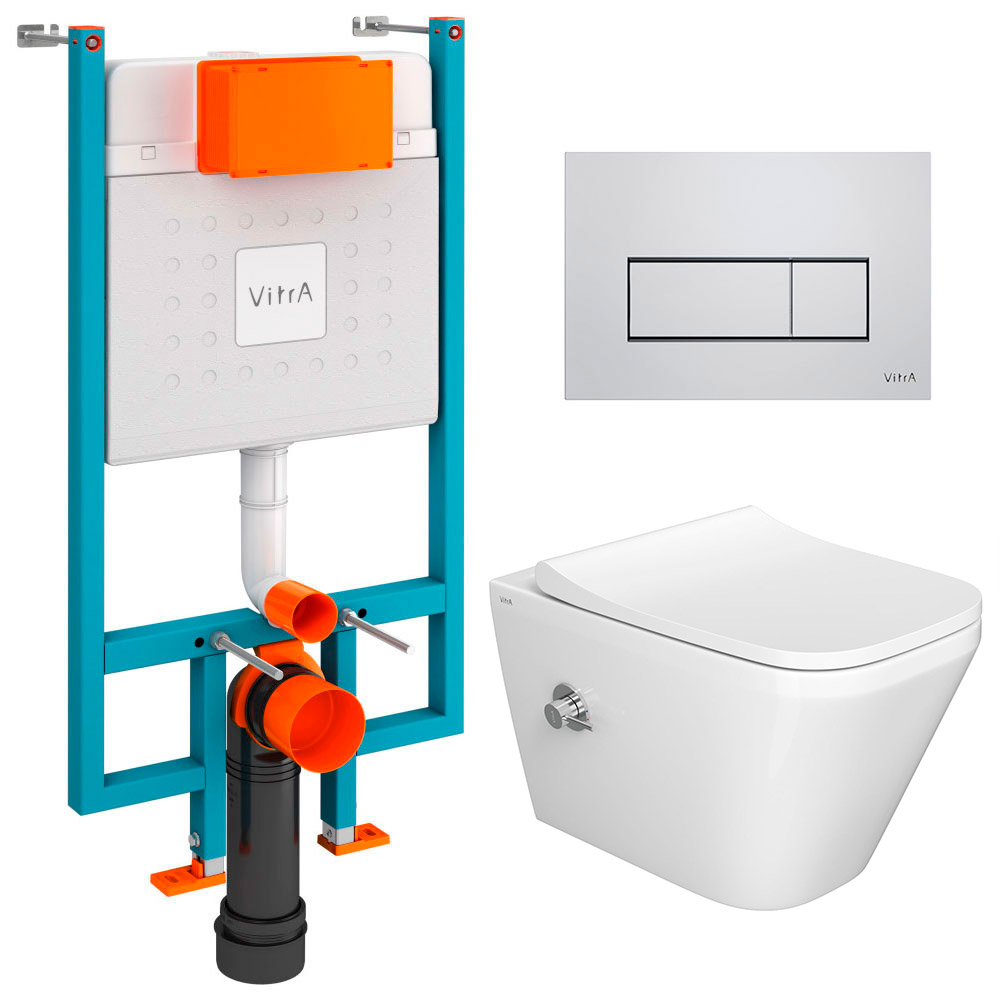 Унитаз-биде с инсталляцией 5в1 VitrA Integra 7082B003-7209 безободковый, V-fix Core 800-1875, клавиша хром Root S 740-2380