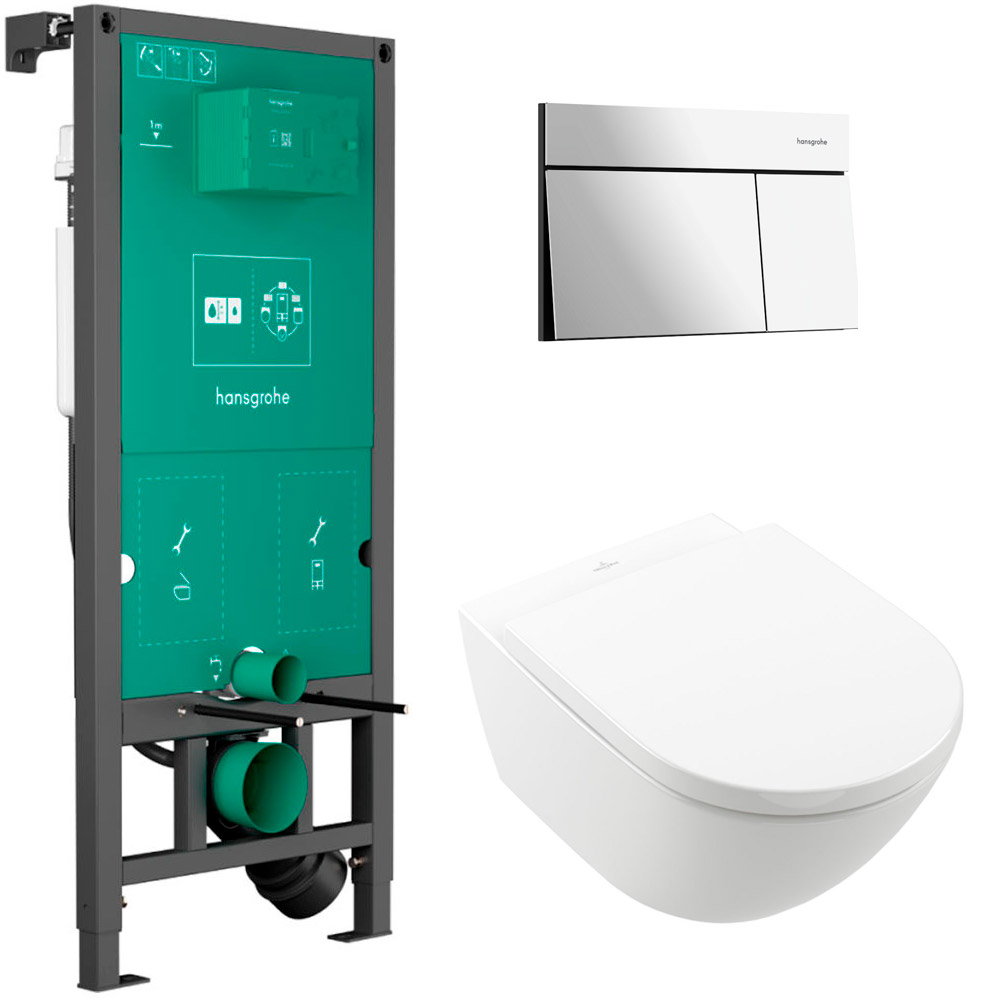 Унитаз с инсталляцией 5в1 Villeroy&Boch Subway 3.0 4670TS01 безободковый TwistFlush, hansgrohe iFrame 01022180, клавиша хром Element E 66003000