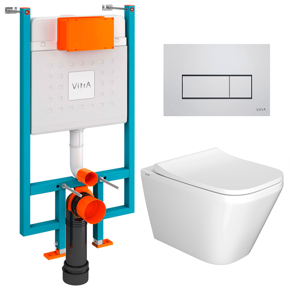 Унитаз с инсталляцией 5в1 VitrA Integra Square 7082B003-0075 безободковый, V-fix Core 800-1875, клавиша хром Root S 740-2380
